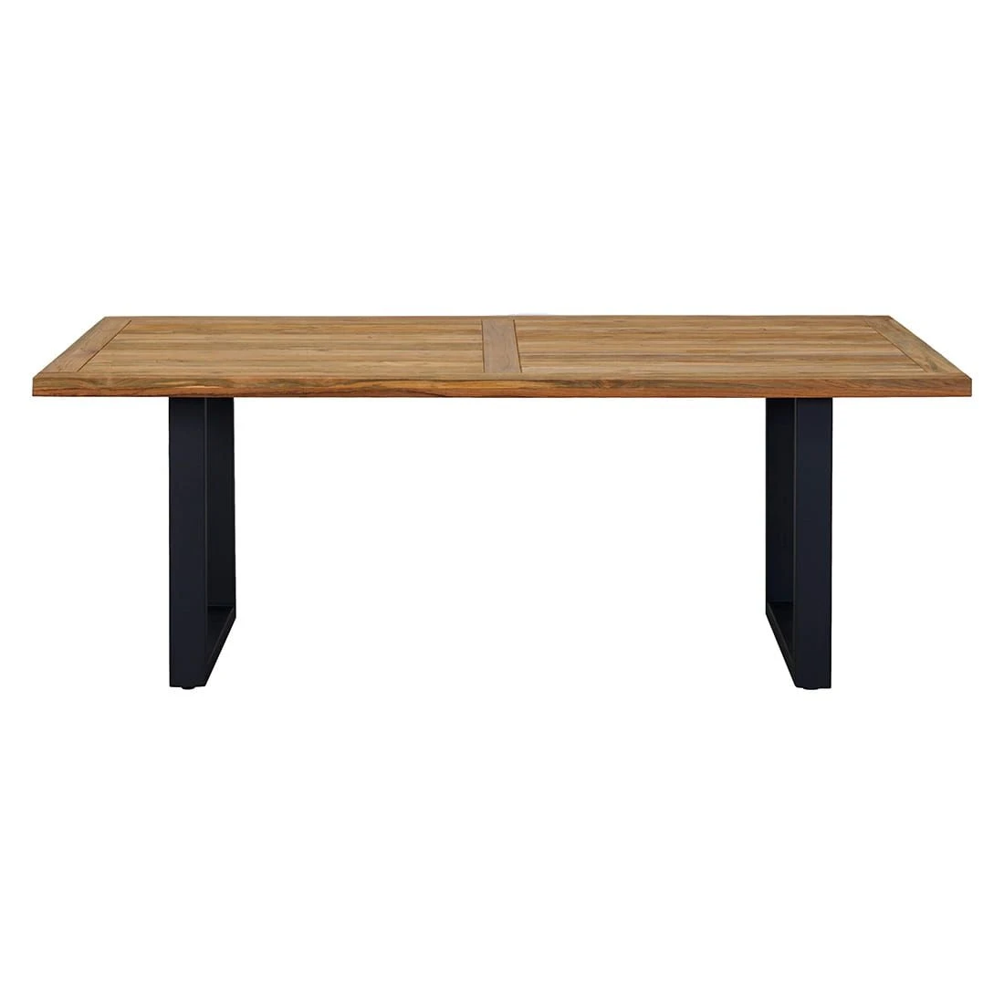 Im Setangebot enthalten ist auch ein passender Tisch. Die Tischplatte wird aus recyceltem, also wiederverwertetem, Teak gefertigt. Hier werden bewusst alte Gebrauchsspuren wie Kerben oder Nagellöcher erhalten, so dass jeder Tisch ein wahres Unikat ist. Das Gestell besticht mit seinen attraktiven Kufen. Die Form des Tisches ist klassisch rechteckig gehalten.