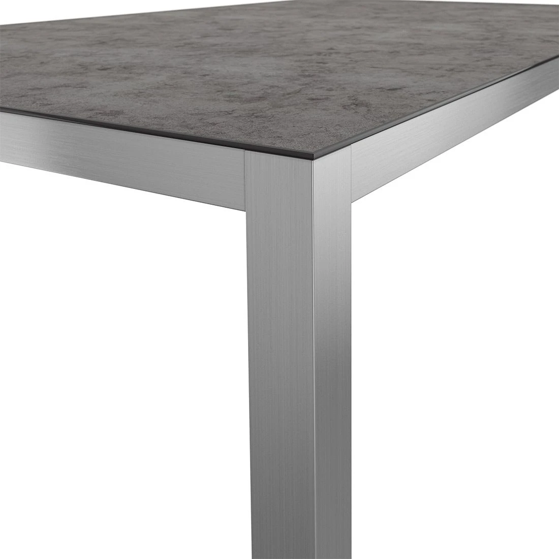 Als Gestellmaterial wird auserlesener und rostfreier Edelstahl verwendet. Das klassische Vierfuß-Gestell garantiert Ihnen maximale Beinfreiheit. Für die Herstellung der Tischplatte wird robustes Glas verwendet. Farblich ist die Tischplatte in einem schönen Dark Grey gehalten. Der Gartentisch ist klassisch rechteckig gestaltet.