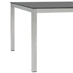 Das Gestell ist aus rostfreiem und pflegeleichtem Edelstahl gefertigt und äußerst windsicher auf der Terrasse. Für die Herstellung der Tischplatte wird robustes Glas verwendet. Für ein stimmiges Gesamtbild erscheint die Platte in der Farbe Dunkelgrau.