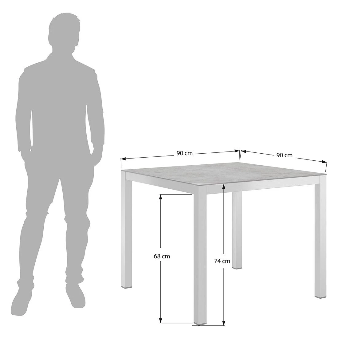 Als Gestellmaterial wird qualitativ hochwertiger und rostfreier Edelstahl verwendet. Als klassische Design-Komponente fungiert das geradlinige Vierfußgestell. Die Tischplatte ist aus wunderschönem Keramik-Glas gefertigt. Im Gegensatz zu vielen anderen Tischplattenmaterialien sind solche Platten äußerst kälte- und hitzebeständig und zählen somit zu den robustesten Tischplatten auf dem Markt. Farblich ist die Tischplatte in einem schönen Dunkelgrau gehalten. Mit der kompakten quadratischen Form sorgt der Gartentisch auch auf beschränktem Raum für Gemütlichkeit.