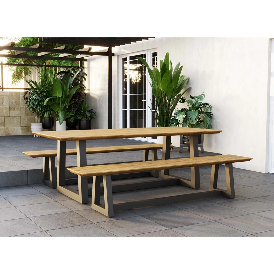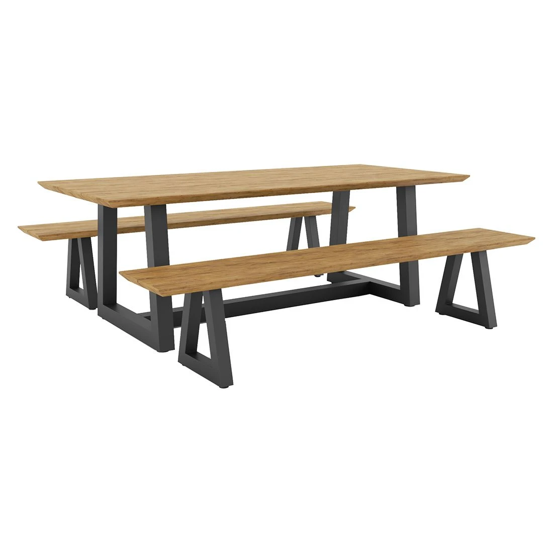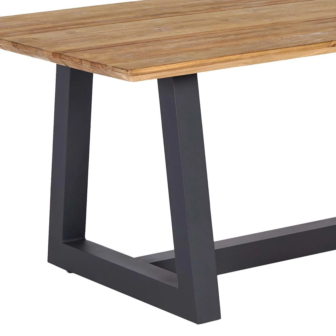 Die Sitzfläche und die Tischplatte sind aus Teak gefertigt. Damit das Gartenmöbel-Set optisch ansprechend ist, sind die Tischplatte und die Sitzfläche im Farbton Natur gehalten. Das Gestell ist aus Aluminium gefertigt. Dadurch lassen sich die Möbel leicht von einem Standort zum nächsten transportieren und sind dennoch sehr stabil. Optisch ansprechend ist die Farbgebung der Gestelle in Anthrazit. Die rechteckige Form ermöglicht es Ihnen, den Tisch in Ecken und an Häuserwänden platzsparend einzusetzen.
