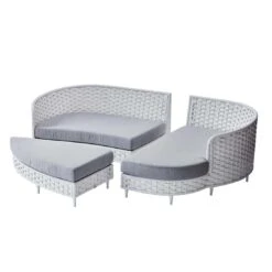 Damit die Sonneninsel optisch ansprechend ist, sind das Gestell und die Sitzfläche im Farbton Weiß gehalten. Das Gestell ist aus Aluminium hergestellt. Das Gestell, das mit hochwertigem Polyrattan umflochten ist, bringt ein natürliches Ambiente auf Ihre Terrasse. Dieses Material zeichnet sich durch eine hohe Wetterbeständigkeit aus. Die Sitzfläche ist angenehm gepolstert. Die Farbe des Bezugs ist Grau. Die Tischplatte ist Hellgrau.