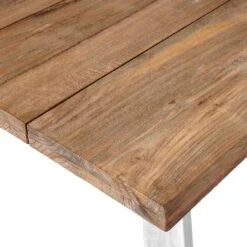Zum Lieferumfang des Sets gehört auch ein passender Tisch. Als Material für die Tischplatte wird das hochwertige Hartholz Teak gewählt. Die Maserung dieses Holzes und der warme Farbton integrieren sich sehr angemessen in die Umgebung eines jeden Gartens und verströmen eine besonders natürliche Atmosphäre. Klassisch aus vier Tischbeinen besteht das Gestell des Tisches. Mit der rechteckigen Form lässt sich der Tisch platzsparend in Ecken oder an Häuserwänden aufstellen.