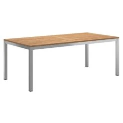 Zum Lieferumfang des Sets gehört auch ein passender Tisch. Als Material für die Tischplatte wird das edle Hartholz Teak gewählt. Die Maserung des Holzes und der helle Farbton integrieren sich perfekt in das Gesamtbild eines jeden Gartens und verbreiten eine besonders natürliche Atmosphäre. Das klassische Vierfuß-Gestell garantiert Ihnen maximale Beinfreiheit. Mit der rechteckigen Form lässt sich der Tisch platzsparend in Ecken oder an Häuserwänden aufstellen.