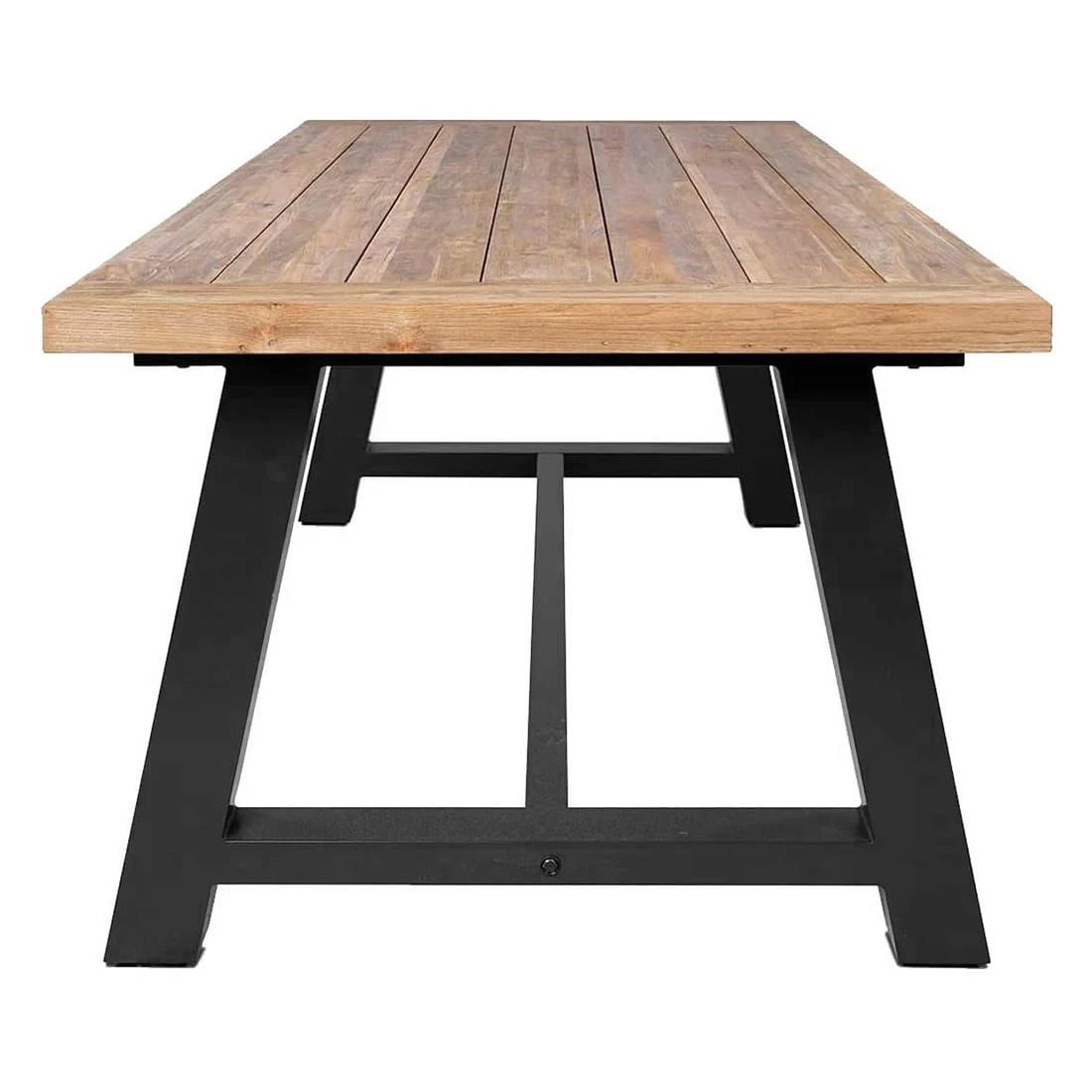 Im Setangebot enthalten ist auch ein passender Tisch. Die Tischplatte wird aus recyceltem, also wiederverwertetem, Teak gefertigt. Hier werden bewusst alte Gebrauchsspuren wie Kerben oder Nagellöcher erhalten, so dass jeder Gartentisch ein wahres Unikat ist. Klassisch aus vier Tischbeinen besteht das Gestell des Tisches. Die rechteckige Form ermöglicht es Ihnen, den Tisch in Ecken und an Häuserwänden platzsparend einzusetzen.