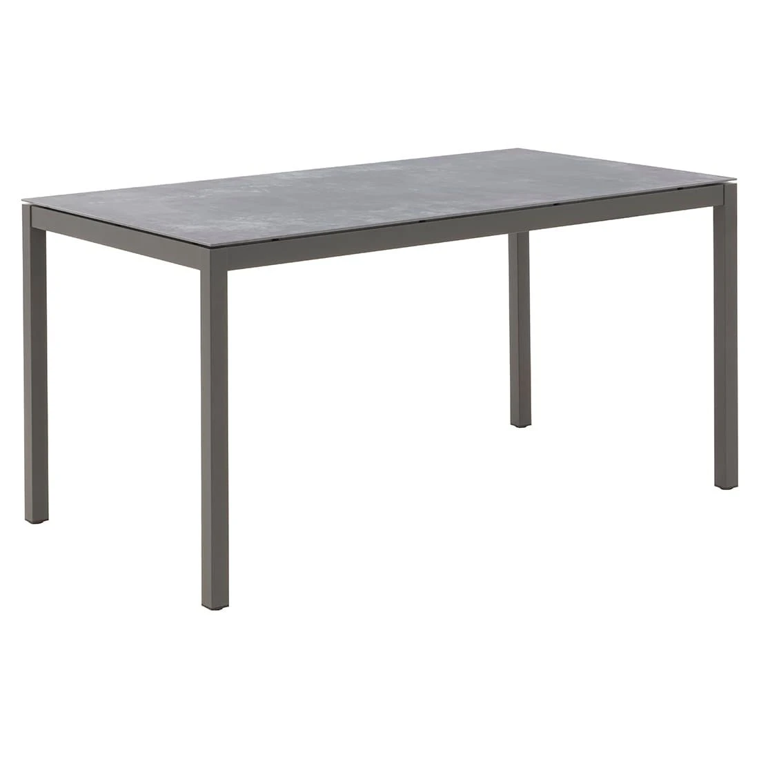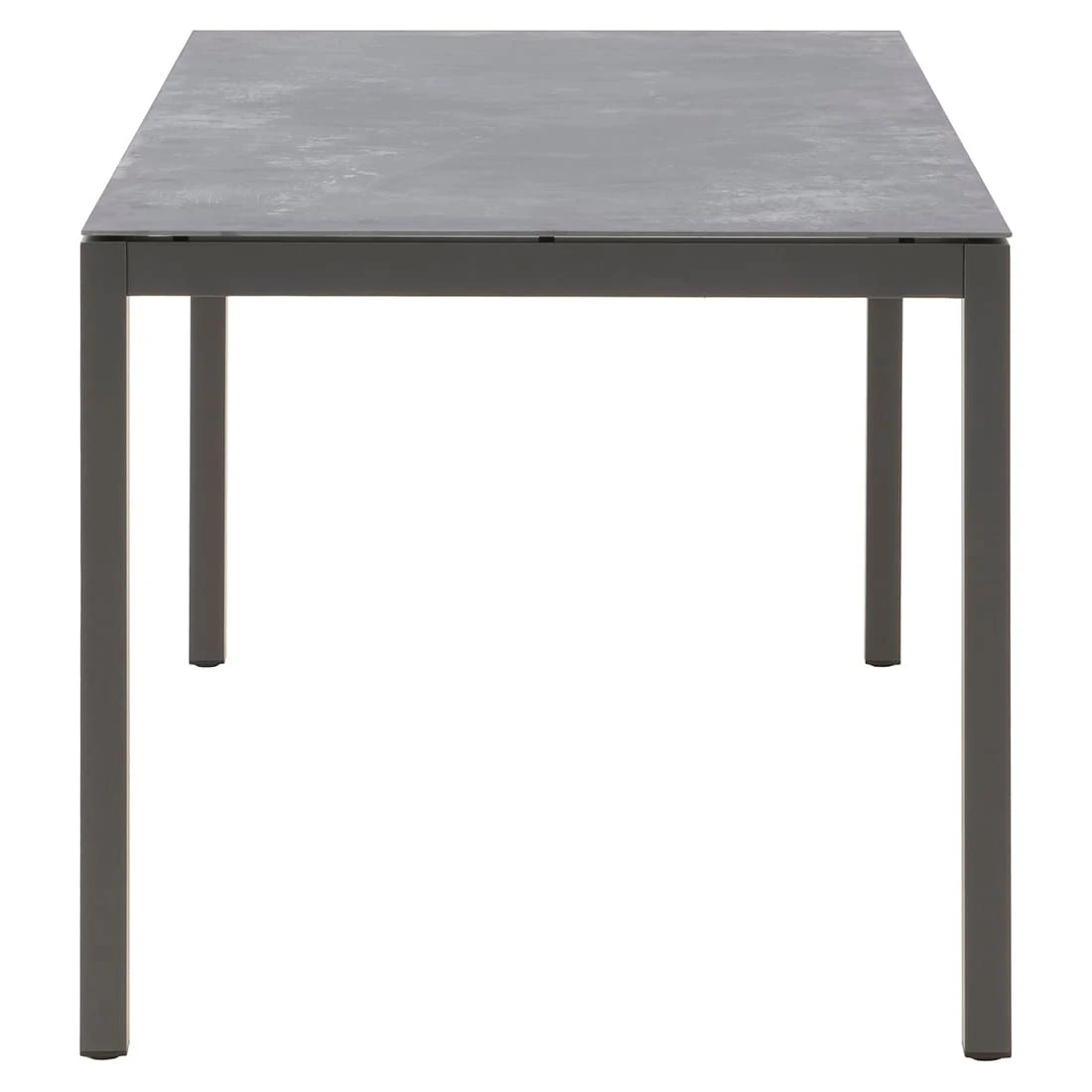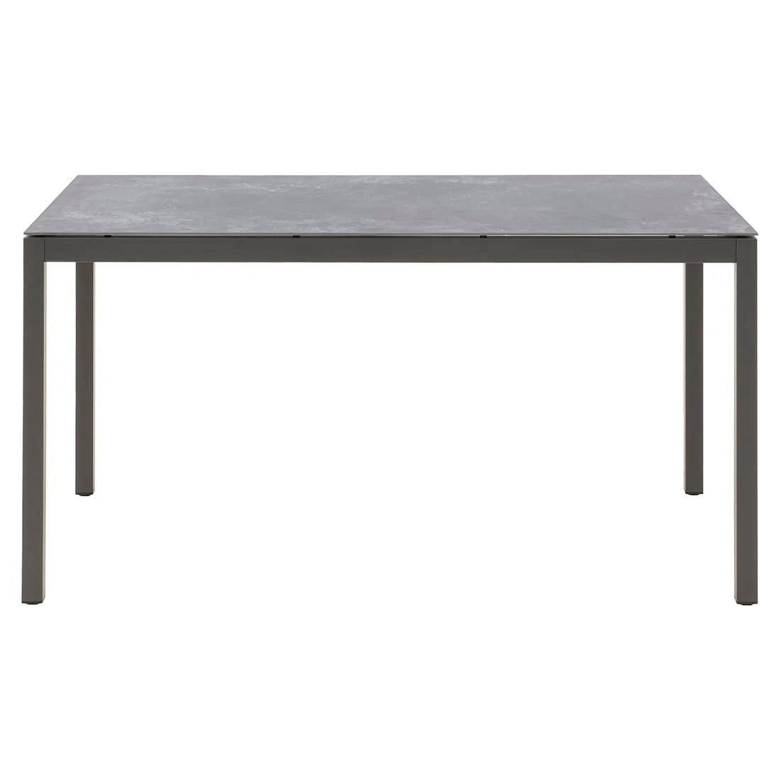 Das Gestell des leichten Tisches ist aus Aluminium gefertigt. Als klassische Design-Komponente fungiert das geradlinige Vierfußgestell. Für die Tischplatte wird das Naturmaterial Keramik verwendet. Keramikplatten sind stoß-, schlag- und schnittbeständig und zählen somit zu den stabilsten Tischplatten auf dem Gartentisch-Markt. Farblich ist die Platte in Anthrazit gehalten. Die Form des Gartentisches ist klassisch rechteckig gestaltet.