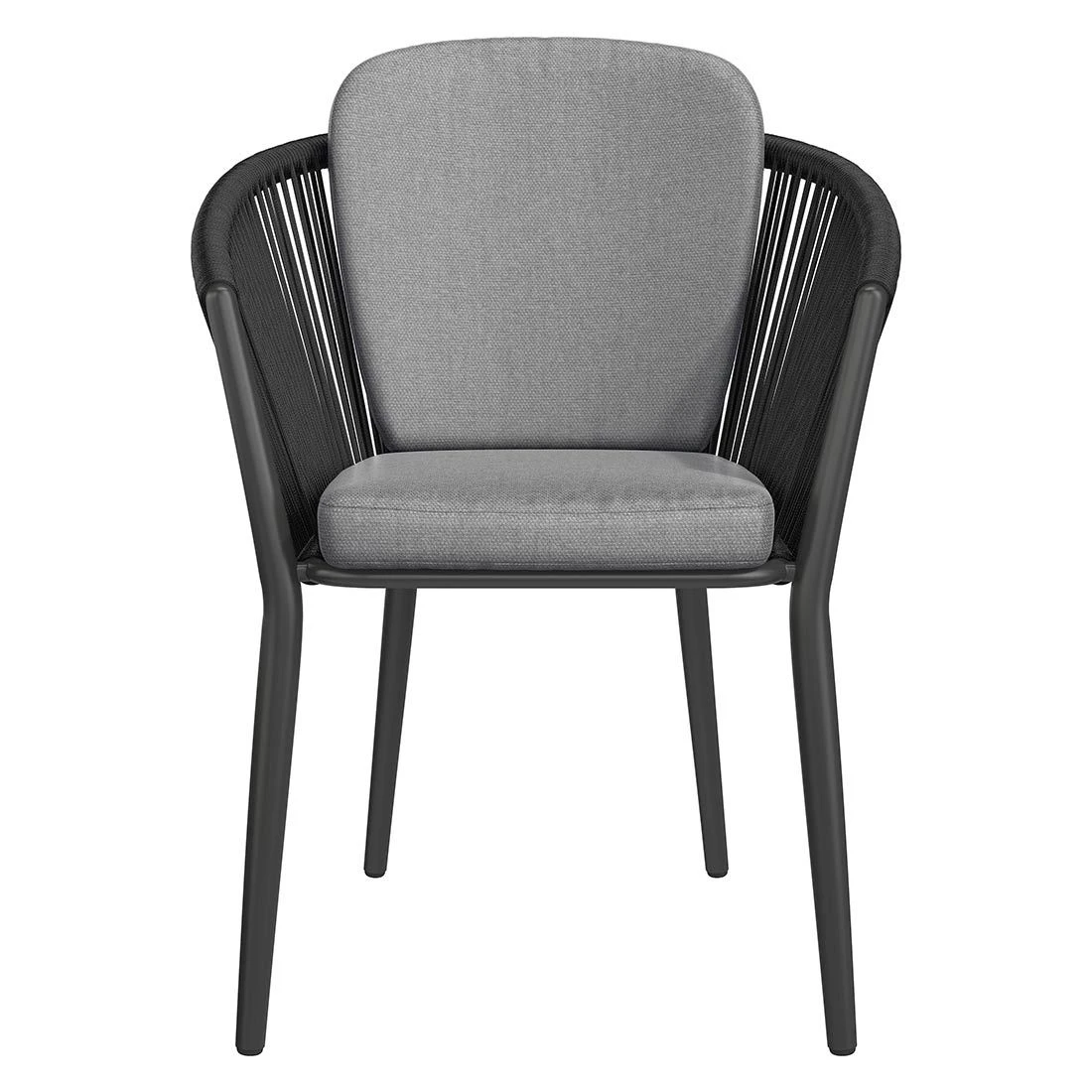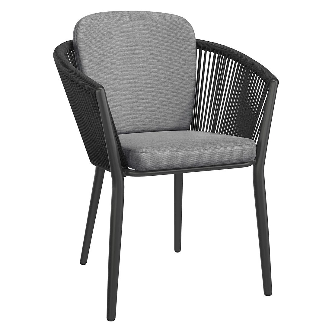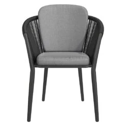 Das Gestell besteht aus pflegeleichtem und wetterfestem Aluminium. Hochwertiges Rope umgibt das robuste Gestell und verleiht dem Gartensessel damit einen ganz besonderen Look. Für die Bezüge wird Olefin verwendet. Der Marken-Outdoorstoff überzeugt mit einer hohen Witterungsbeständigkeit. Denn sowohl Sonne als auch Regen können dem robusten Outdoor-Stoff kaum etwas anhaben. Farblich begeistert der Bezug in elegantem Dunkelgrau. Damit der Gartensessel optisch ansprechend ist, sind das Gestell und der Korpus im Farbton Schwarz gehalten.