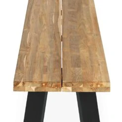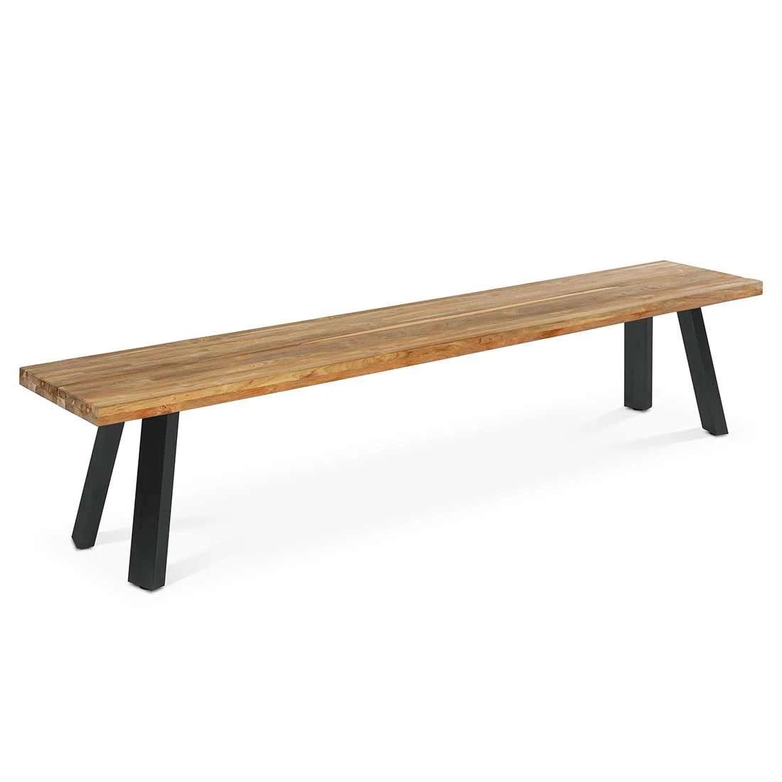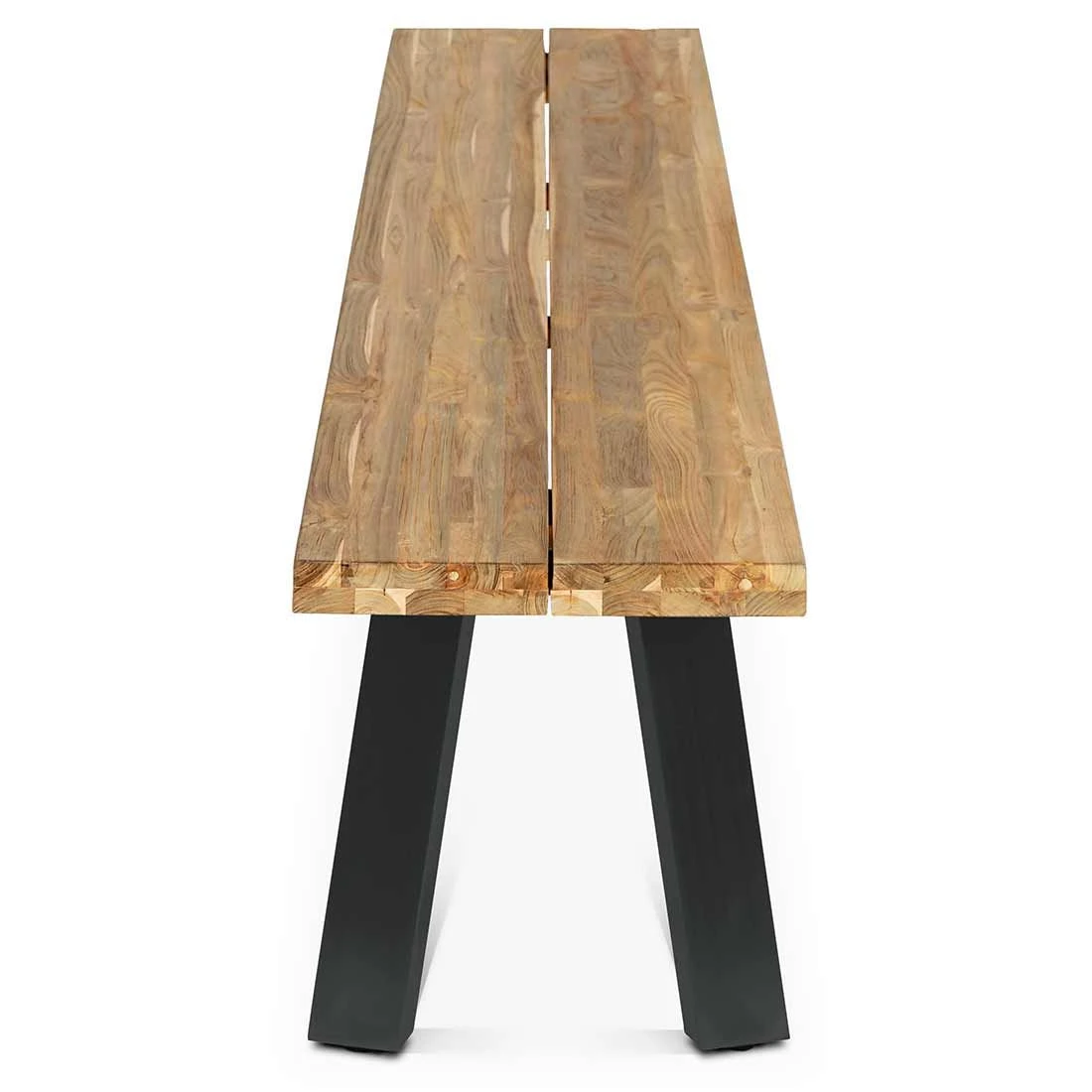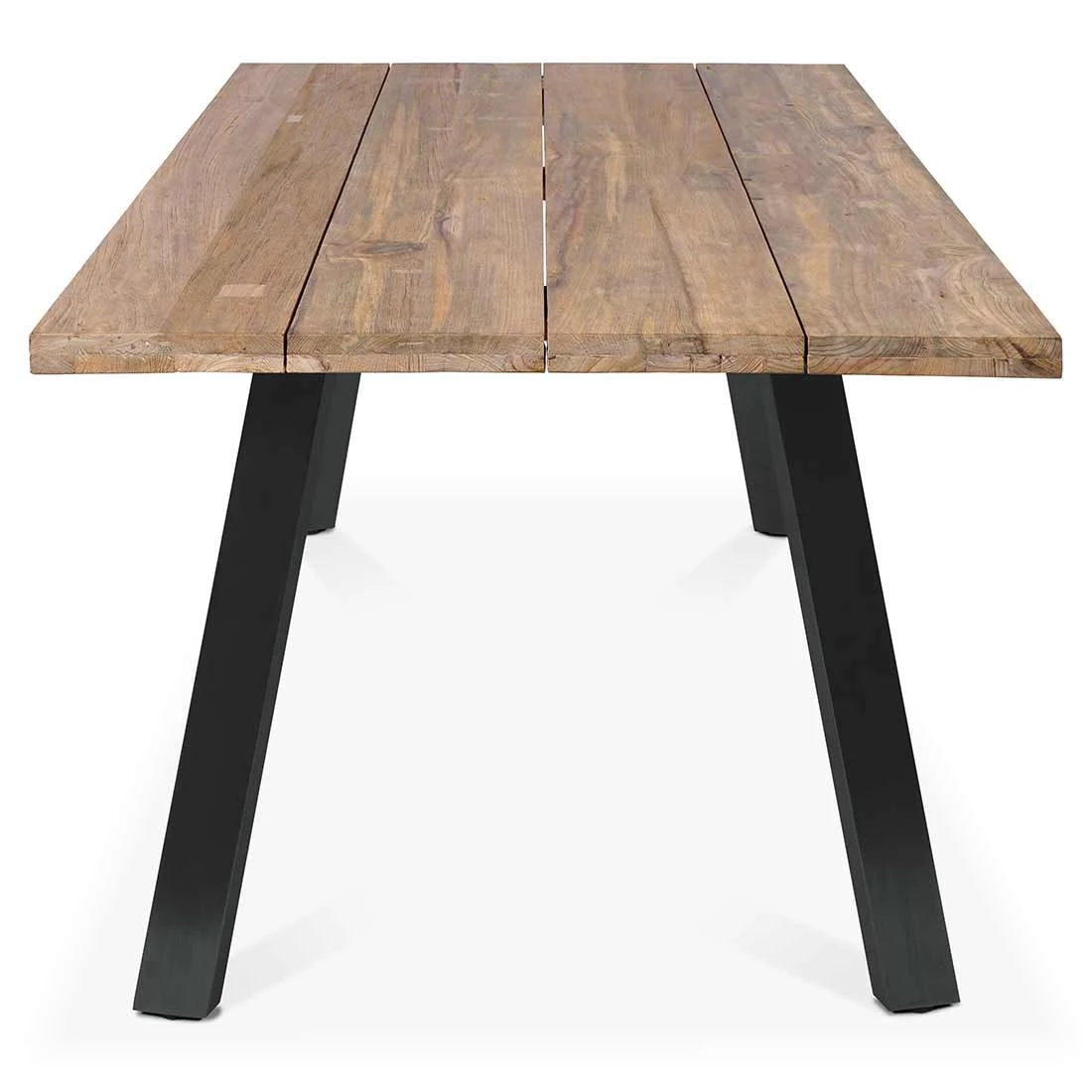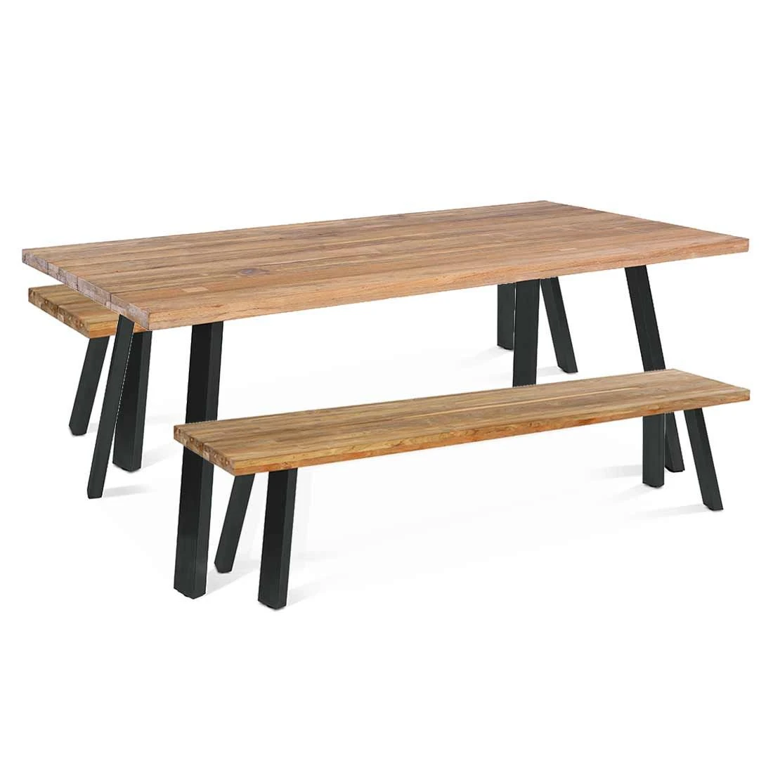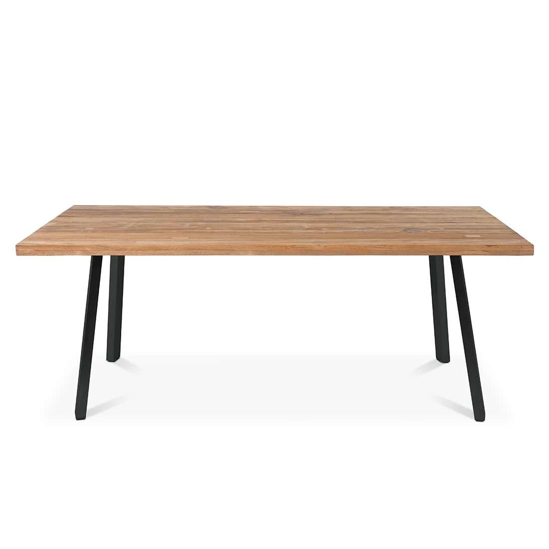 Zum Lieferumfang des Sets gehört auch ein praktischer Tisch. Die Gebrauchsspuren in der Tischplatte sind Teil des Designs der Tischplatte. Denn diese ist aus wiederverwertetem Teak gearbeitet, das zuvor aus alten Hütten und Booten gewonnen wurde. Bei der Aufarbeitung werden dann Einkerbungen, Nagellöcher und Co. bewusst erhalten. Jede Tischplatte und damit jeder Gartentisch ist also ein Unikat. Als klassische Design-Komponente fungiert das geradlinige Vierfußgestell. Die Form des Tisches ist klassisch rechteckig gestaltet.