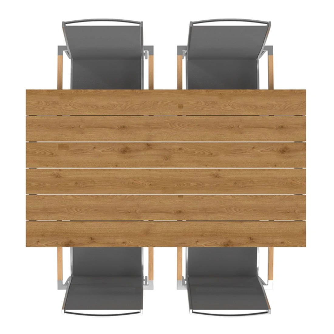 Im Setangebot enthalten ist auch ein passender Tisch. Die Platte wird aus recyceltem, also wiederverwertetem, Teak gefertigt. Hier werden bewusst Altersspuren wie Kerben oder Nagellöcher erhalten, so dass jeder Gartentisch ein wahres Unikat ist. Die Form des Tisches ist klassisch rechteckig gestaltet.