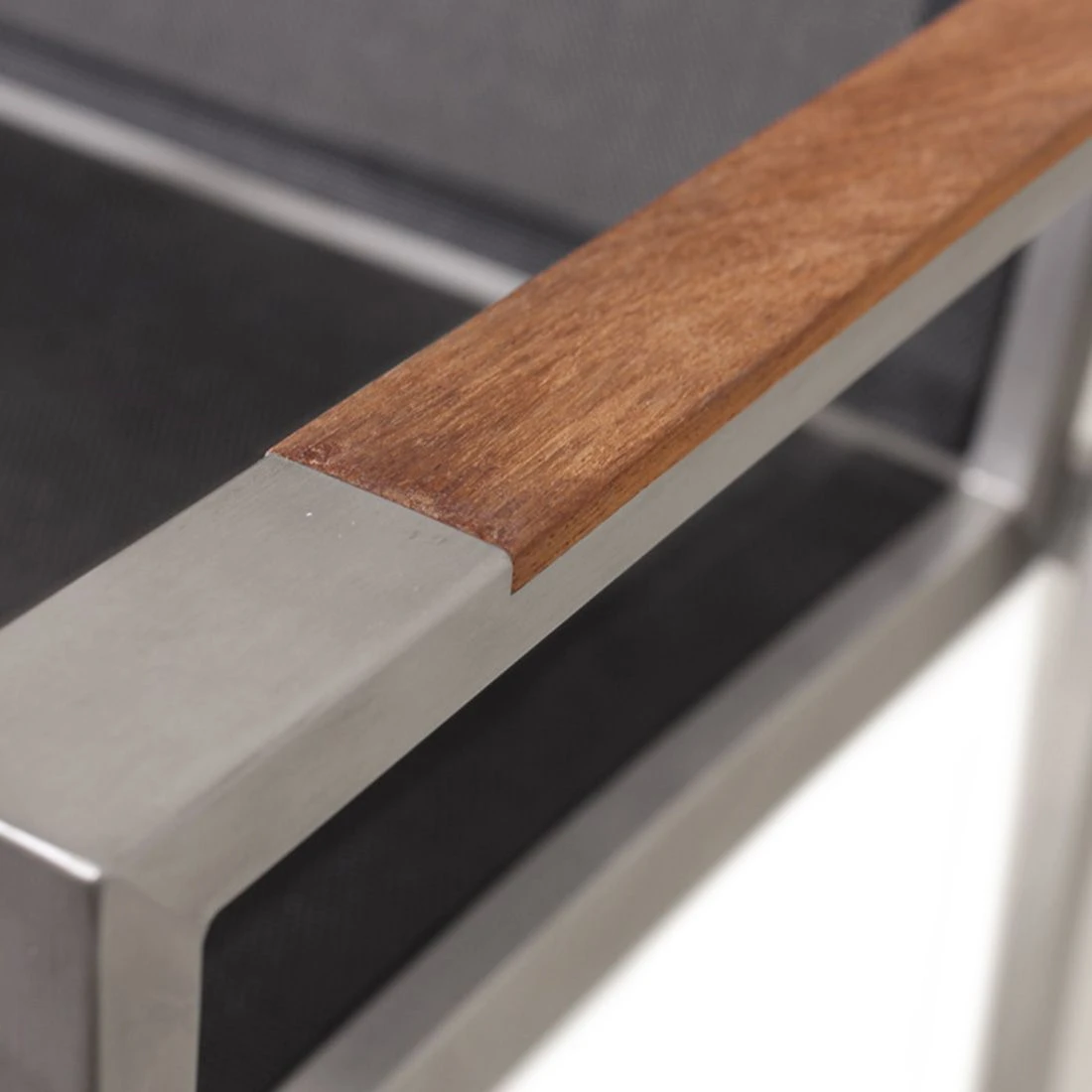 Die Gestelle sind aus Edelstahl gefertigt und sorgen somit für einen modernen Look und eine hohe Stabilität. Ein der Sitzmöbel ist die Bespannung der Sitzflächen mit Textilene. Dieses Material zeichnet sich durch eine hohe Robustheit gegenüber Hitze und Frost aus und ist leicht zu reinigen.