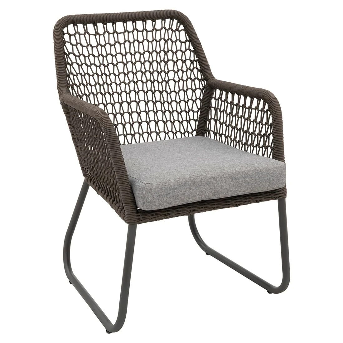 Für die Herstellung des Gestells wird hochwertiges und wetterfestes Aluminium verwendet. Das Gestell ist mit Rope umflochten und bringt somit modernen Flair auf Ihre Terrasse. Die Sitzfläche des Gartensessels ist mit langlebigem Stoff bespannt. Für ein perfekt stimmiges Gesamtbild sorgt die einheitliche Farbgebung in stilvollem Dunkelgrau.