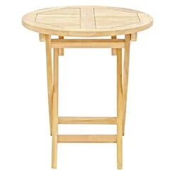 Der Klapptisch ist komplett aus Teakholz gefertigt und gibt so ein angenehm einheitliches Bild auf der Terrasse ab. Für ein stimmiges Gesamtbild erscheint die Platte in der Farbe Teak. Der Klapptisch ist in seinem Design klassisch rund gefertigt.