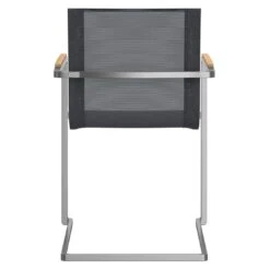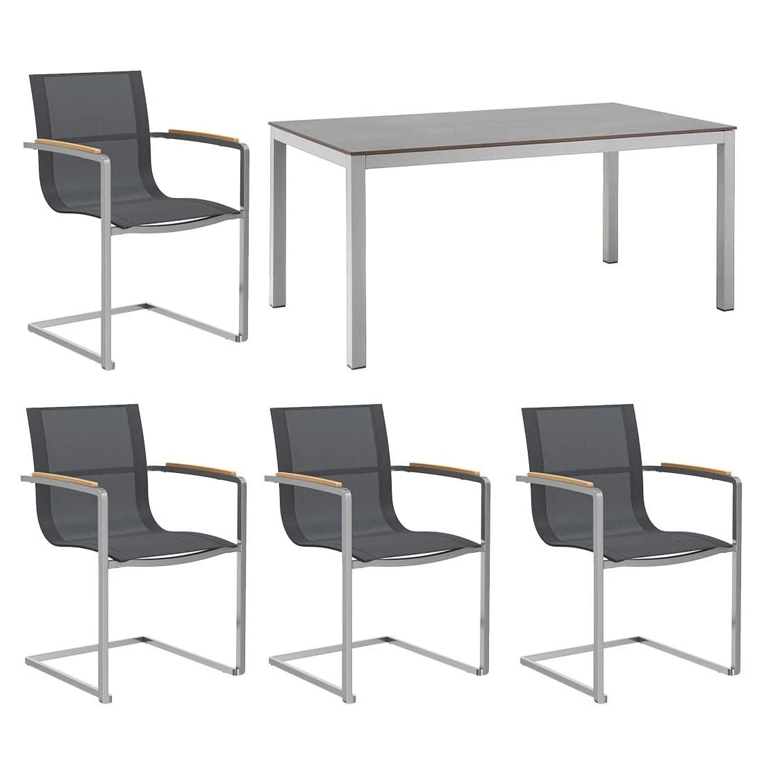 Die Gestelle sind aus Edelstahl gefertigt und sorgen somit für einen modernen Look und eine hohe Stabilität. Optisch ansprechend ist die Farbgebung der Gestelle in Silber. Ein weiteres Highlight der Sitzmöbel ist die Bespannung der Sitzflächen mit Textilene in der Farbe Silber-Schwarz. Dieses Material zeichnet sich durch eine hohe Robustheit gegenüber Hitze und Frost aus und ist leicht zu reinigen. Im Set enthalten ist zudem ein Tisch. Die schöne HPL-Tischplatte ist nicht nur ein optischer Hingucker, sondern besitzt auch eine außerordentlich robuste und durchaus kratzfeste Oberfläche, die sämtlichen Belastungen standhält. Die rechteckige Form ermöglicht es Ihnen, den Tisch in Ecken und an Häuserwänden platzsparend einzusetzen. Als klassische Design-Komponente fungiert das geradlinige Vierfußgestell. Farblich ist das Gestell in Silber gehalten, die Tischplatte überzeugt in der Farbe Zement.