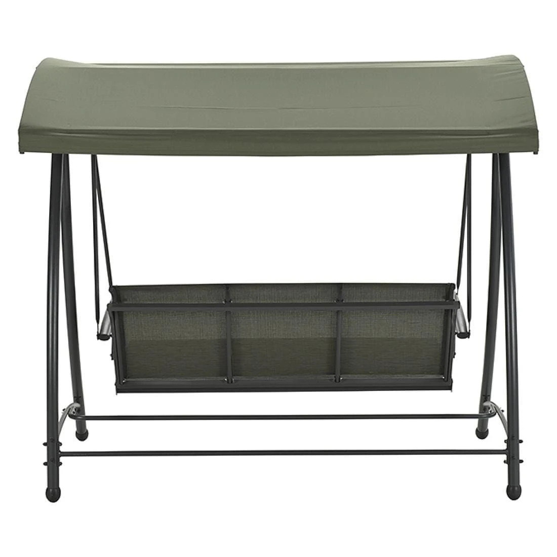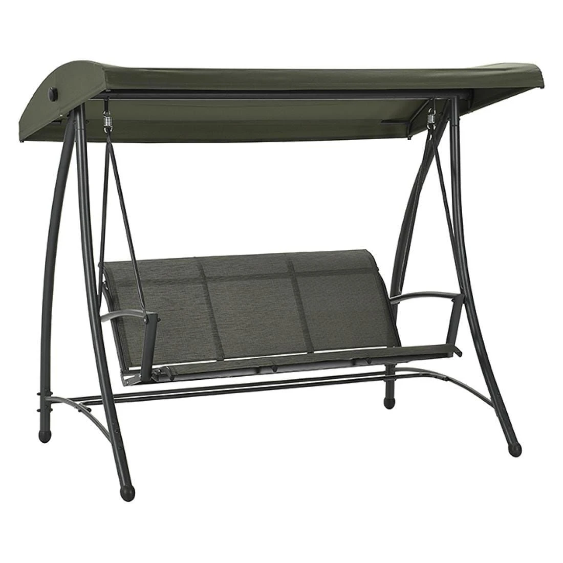 Für den Bezug und die Sitzfläche kommt Textilene zum Einsatz. Das Gestell wird aus robustem Stahl gefertigt. Als Bezug wird ein hochwertiger Stoff verwendet. In diesem Fall kommt wasserabweisendes Textilene zum Einsatz. Dieses Material ist zudem auch schmutzabweisend und schimmelresistent – ideale Voraussetzungen für den Einsatz im Freien. Die Farbe des Bezugs ist Moosgrün. Damit die Hollywoodschaukel optisch ansprechend ist, sind das Gestell und die Sitzfläche im Farbton Carbon Black gehalten.